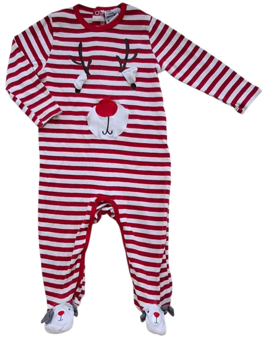 VRS rød og hvidstribet heldragt str. 74 med fødder, Rudolf med den røde tud applikation på forsiden og på fødderne og med tre trykknapper i nakken. 100% bomuld.