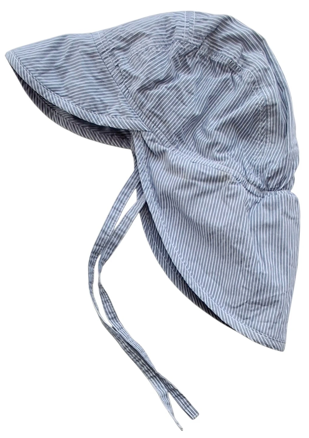 Wheat hvid og blåstribet sommer hat str. M (48 cm) med elastik i nakken, skygge foran og nakkebeskyttelse bagpå og med bindebånd. 100% bomuld.