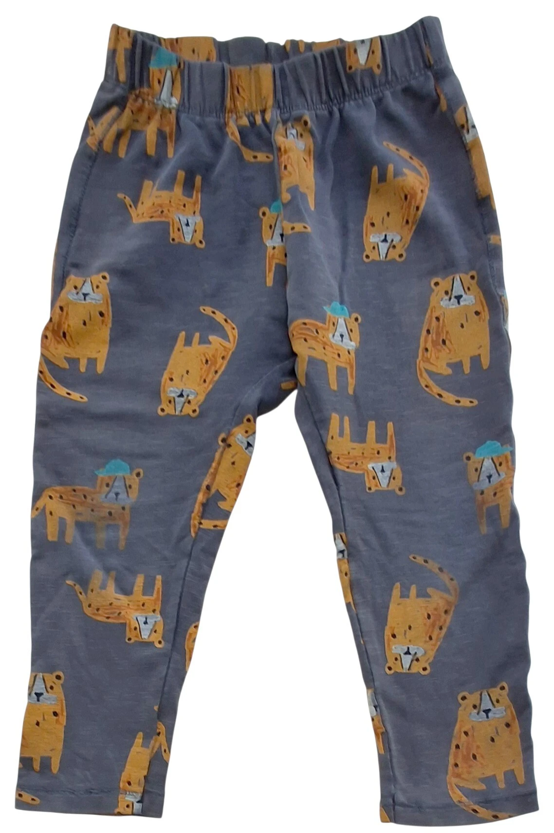 Zara mørkegrå lange bukser str. 104 med tryk af dyr over det hele, og med elastik i taljen.