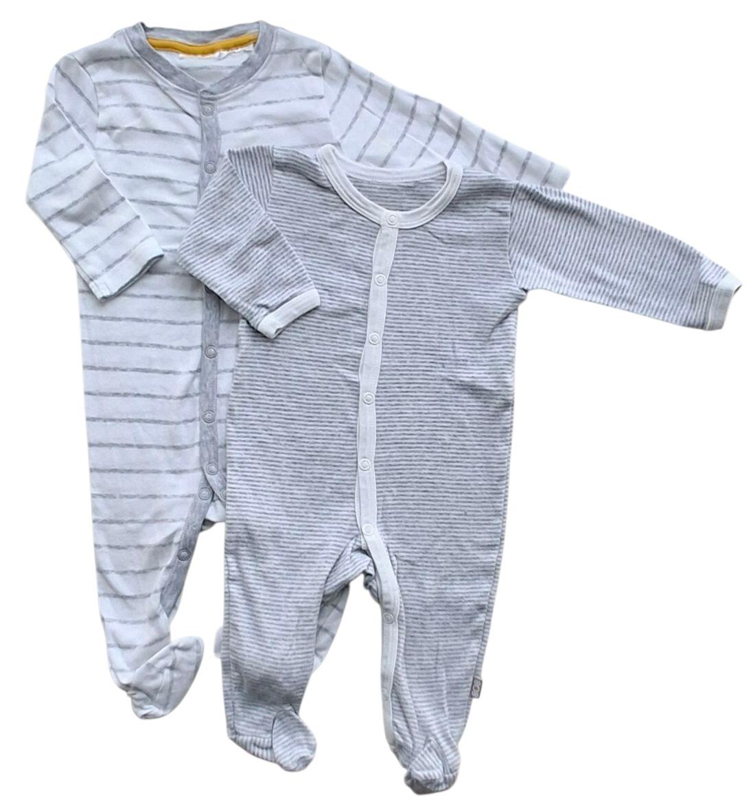 808 to lysegrå langærmede natdragter str. 62. Den ene er af ukendt mærke og den anden fra 808. Begge har fødder og trykknapper fra hals til fod/knæ.