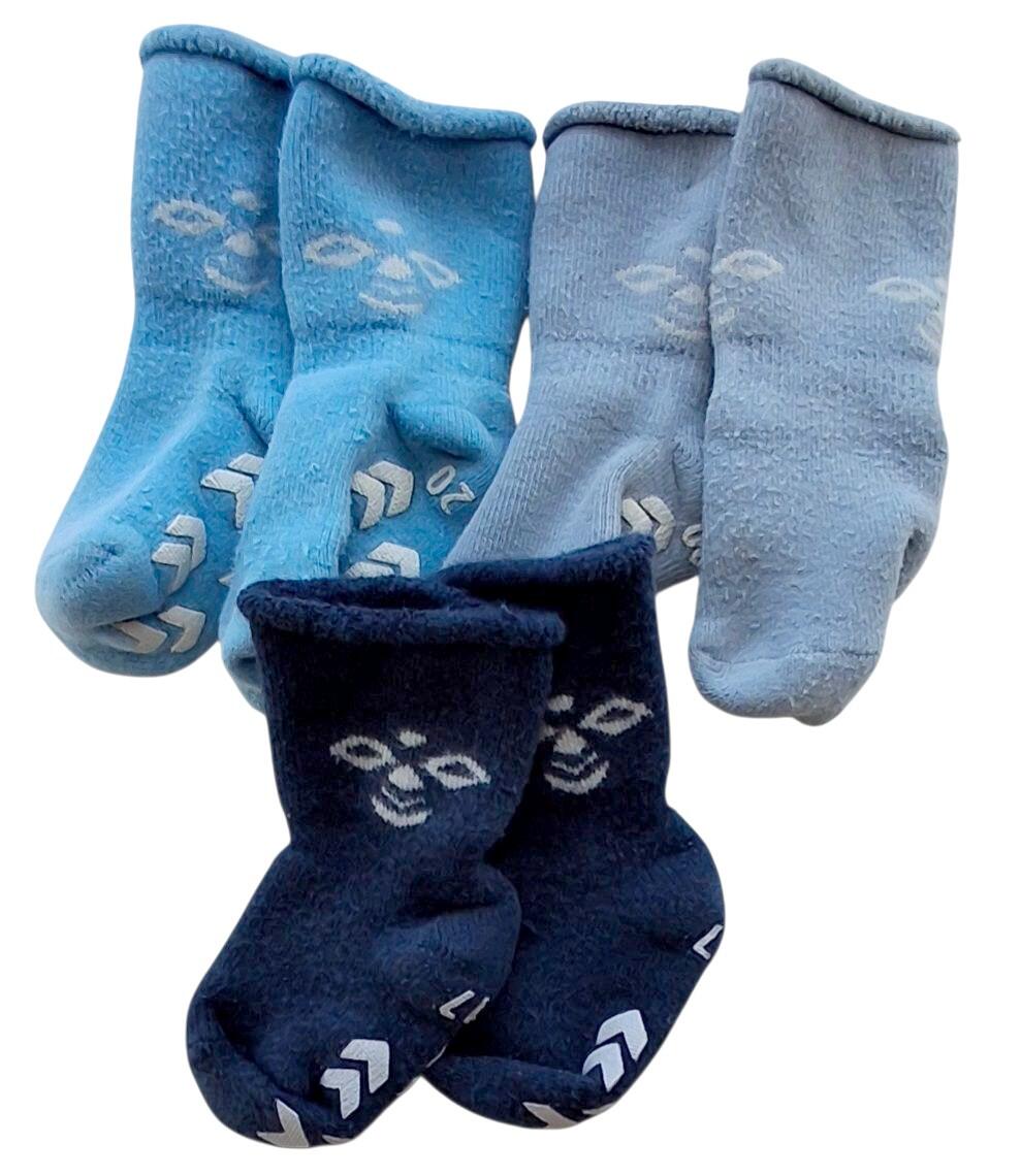 Hummel tre par babystrømper i to størrelser. De mørkeblå er str. 15-17 og de to andre par er str. 18-20. Obs vaskefnuller.