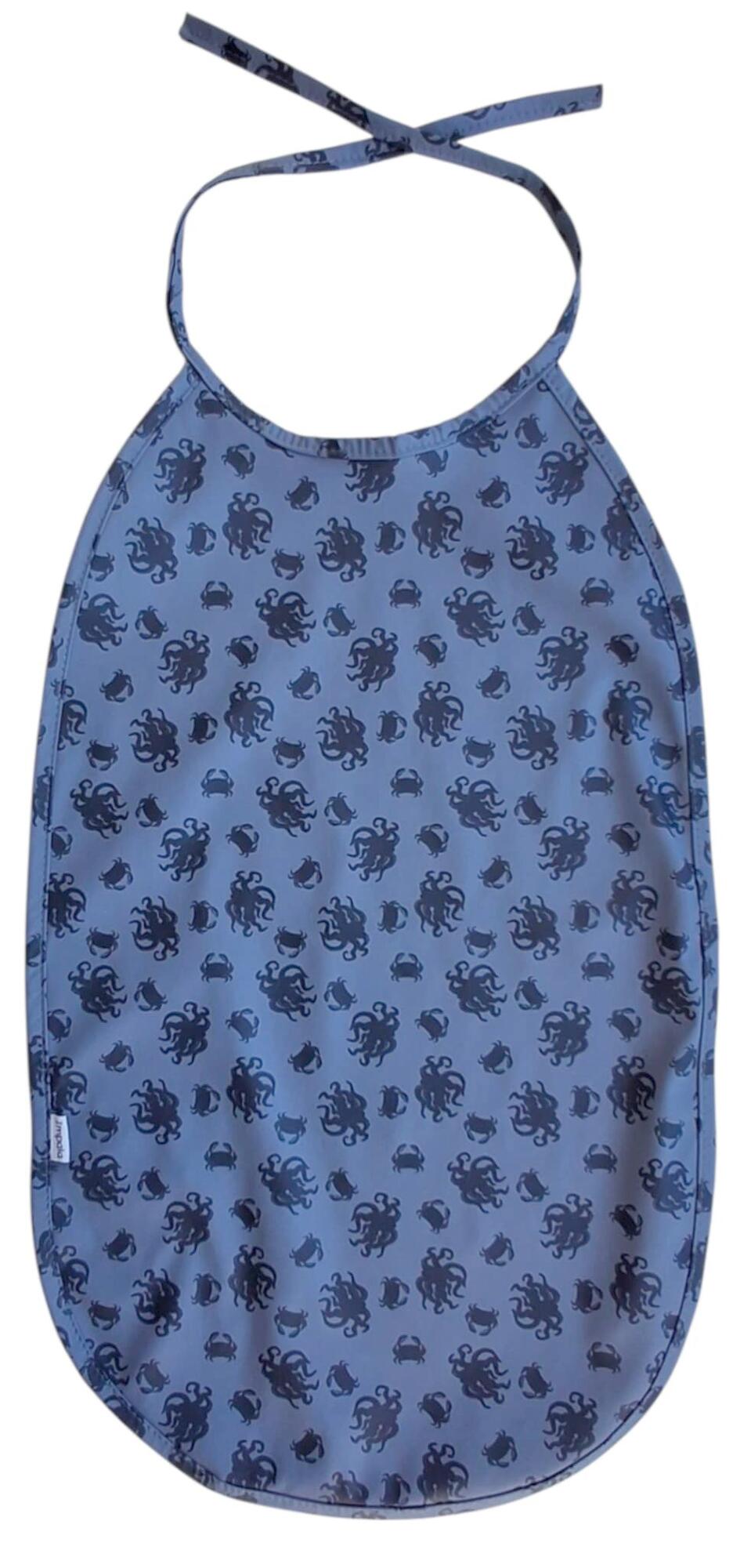 Impala blågrå lang spisesmæk med tryk af krabber og blæksprutter, og med bindebånd i nakken.