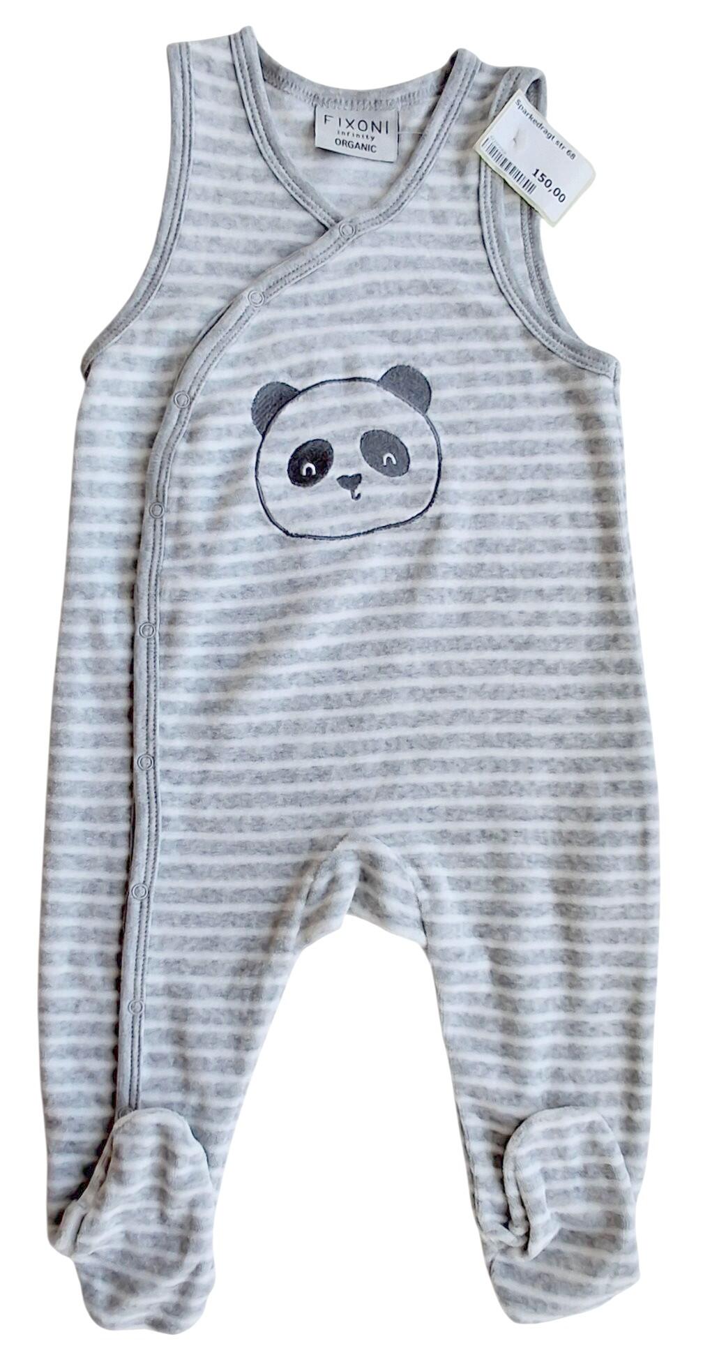 Ny Fixoni lysegrå og hvid stribet velour heldragt med fødder, panda broderi på forsiden og med trykknapper fra hals til fod.