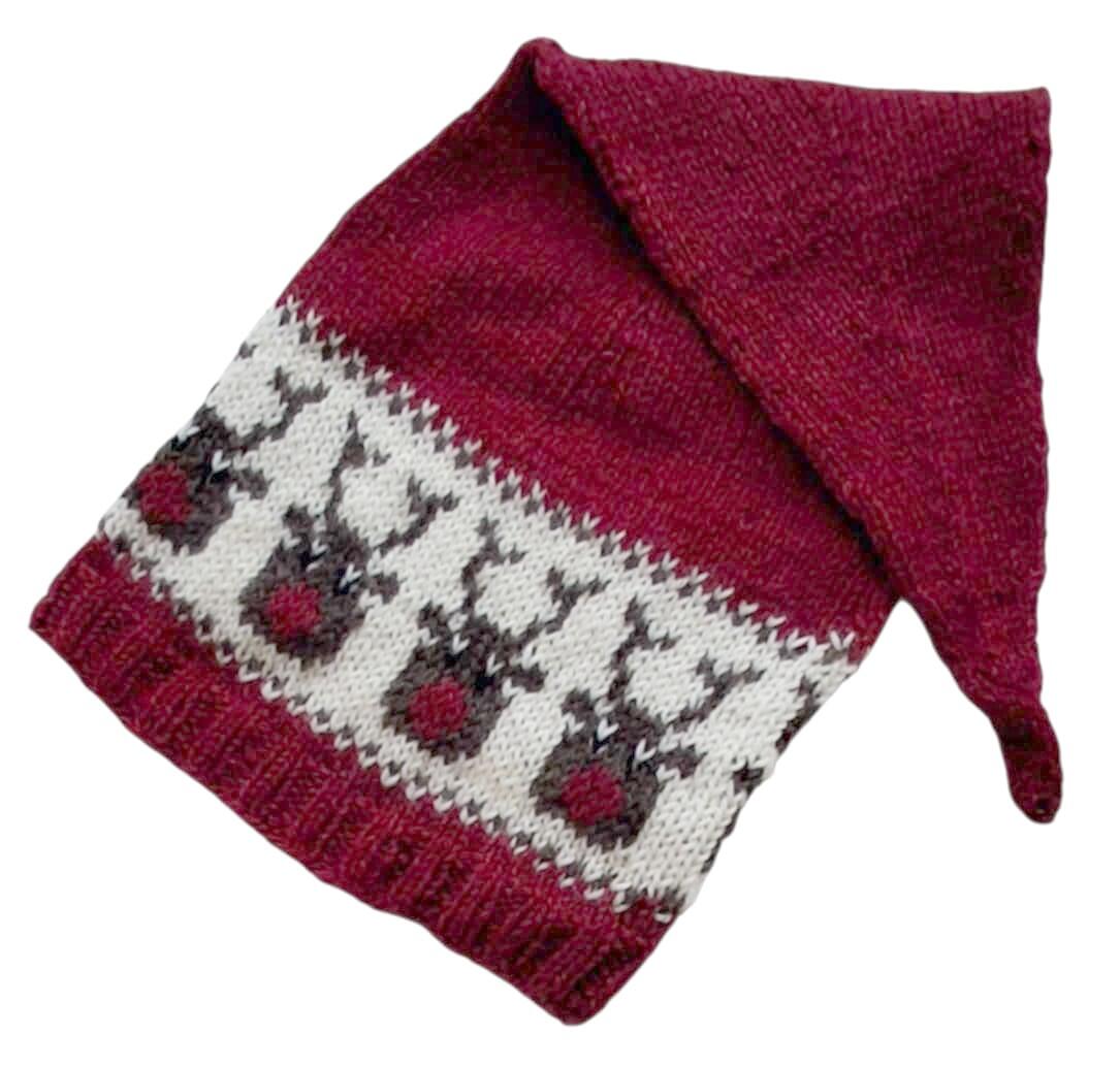 Hjemmestrikket mørkerød uld nissehue str. 48 cm (74-80) med rensdyr og lang top.