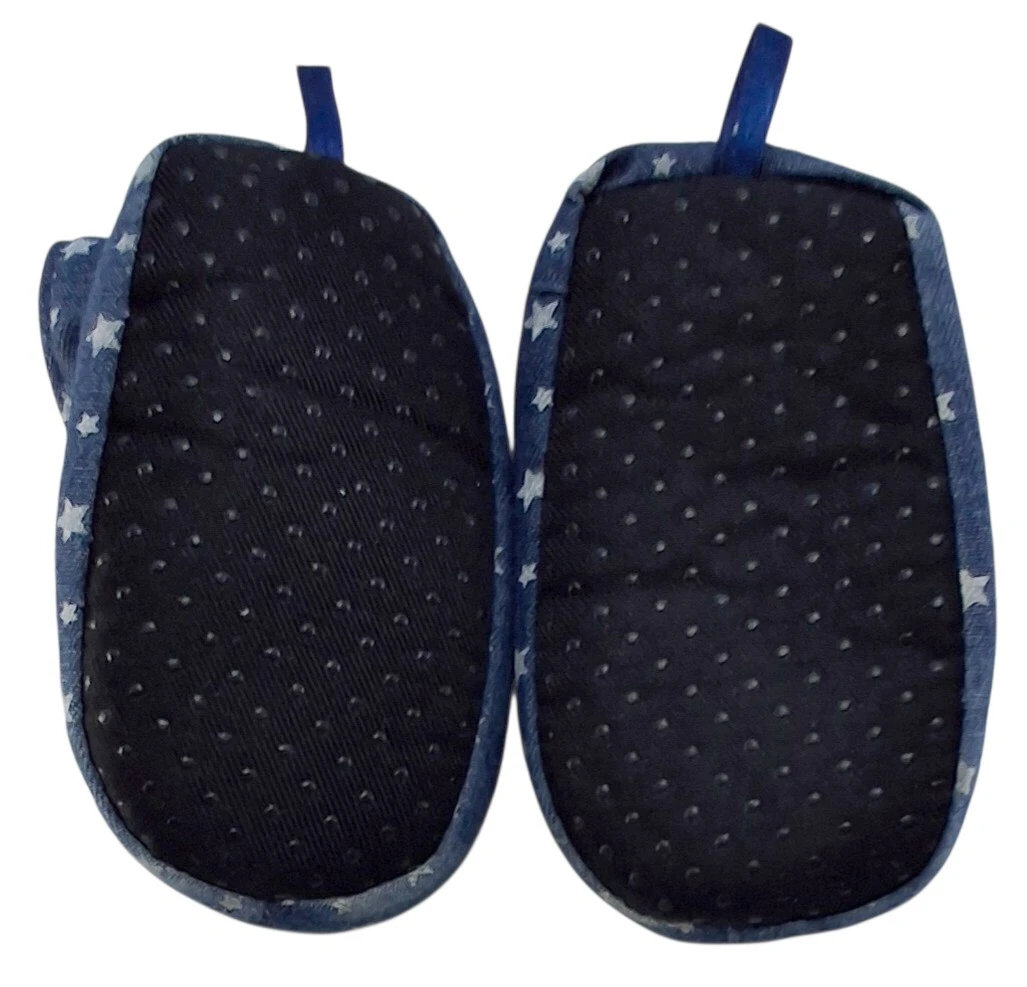 Denimlook blå hjemmefutter str. 20-21 med tryk af stjerner, varmt fleecefor og med elastik og snor omkring anklen.