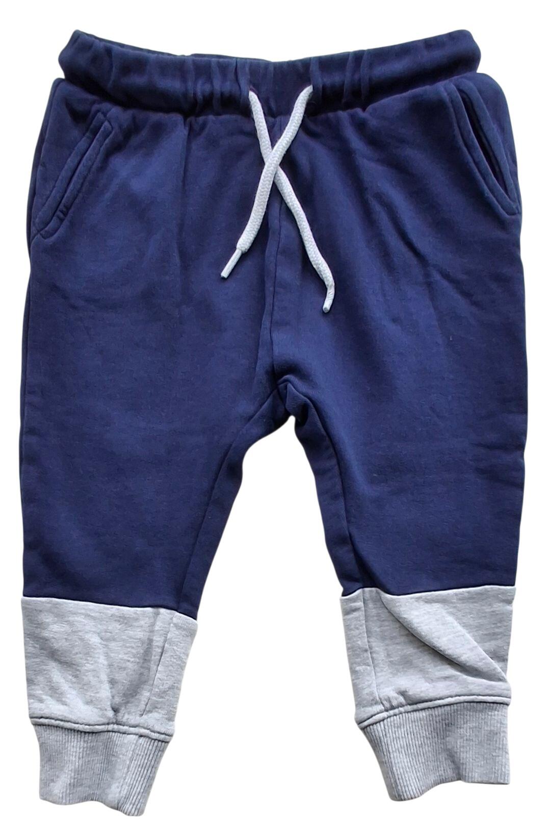 H&M mørkeblå og lysegrå sweat bukser str. 86 med skrålommer, to farvede bukseben og med elastik i taljen.