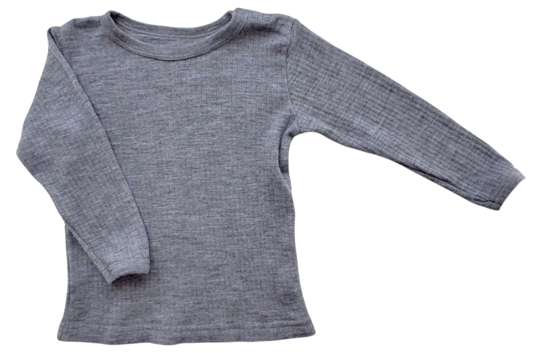808 grå langærmet uld bluse str. 92 i rib kvalitet og med en rund halsudskæring. 100% merinould.