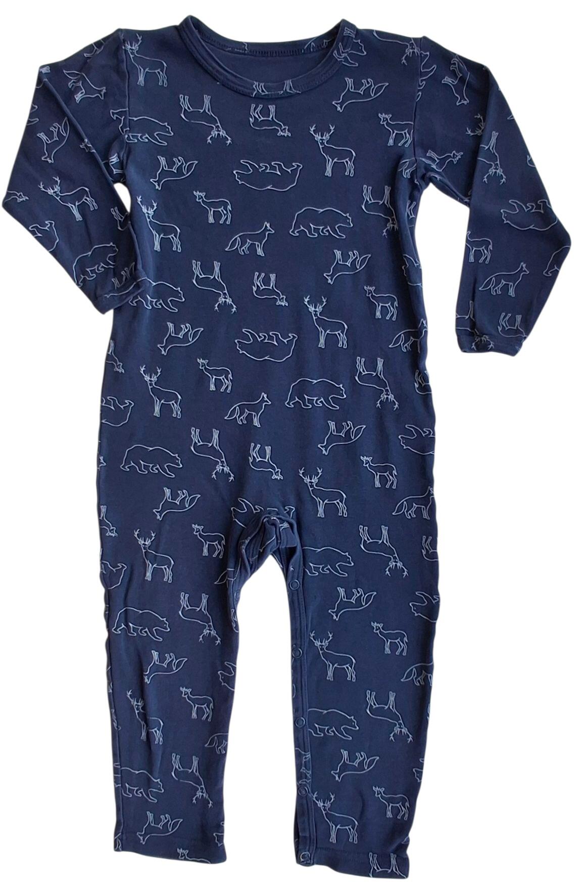 808 mørkeblå langærmet heldragt eller natdragt str. 98 med hvidt tryk af skovens dyr. 100% bomuld.