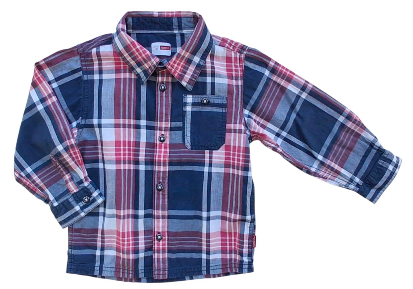 Name it rød og blåternet langærmet skjorte str. 98 med en brystlomme, krave og knapper ned foran. 100% bomuld.