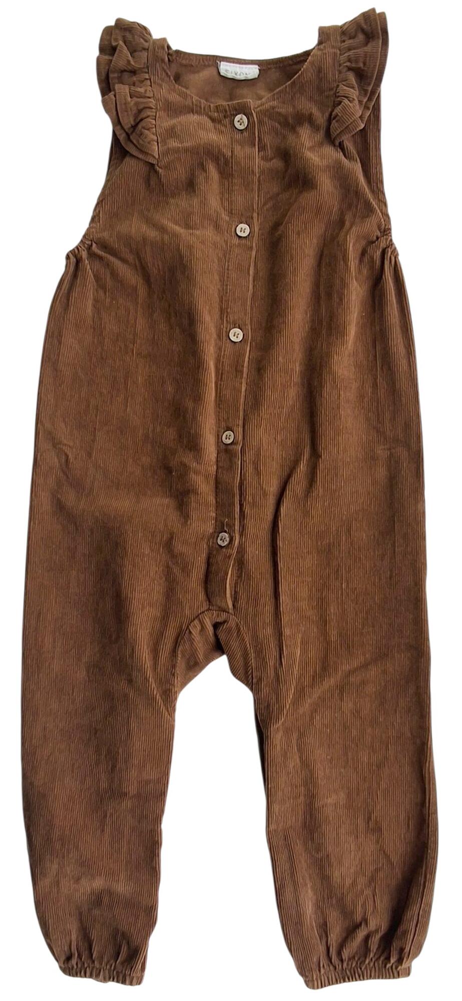Fixoni brun ærmeløs fløjls heldragt str. 86 med søde flæser over skuldrene, elastik i benene og med knapper ned foran.