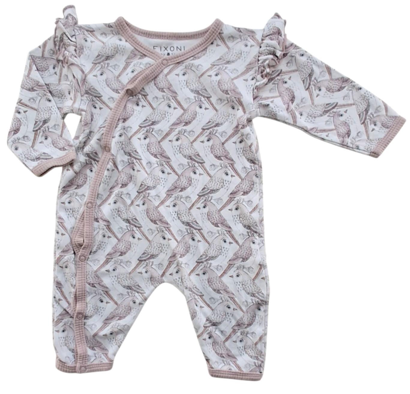 Fixoni hvid og rosa heldragt str. 56 med tryk af små fugle, flæser over skudrene og med trykknapper fra hals til fod.