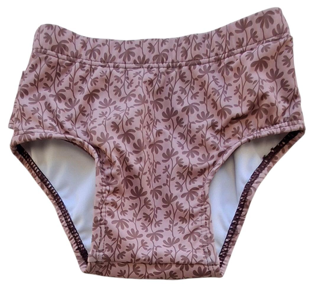 Fixoni rosa småblomstrede blebadebukser str. 74-80 med elastik i taljen og i benene, og lidt flæser på bagsiden.