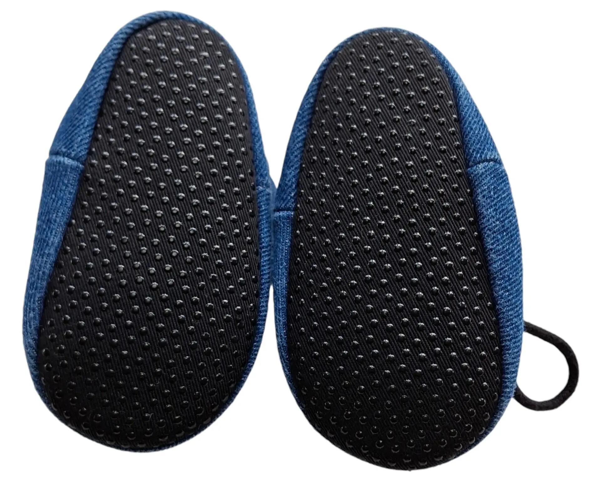 Små blå denimfutter str. 18-19 med gråt for, skridsikker bund med dupper og med en justerbar snor rundt om anklen.