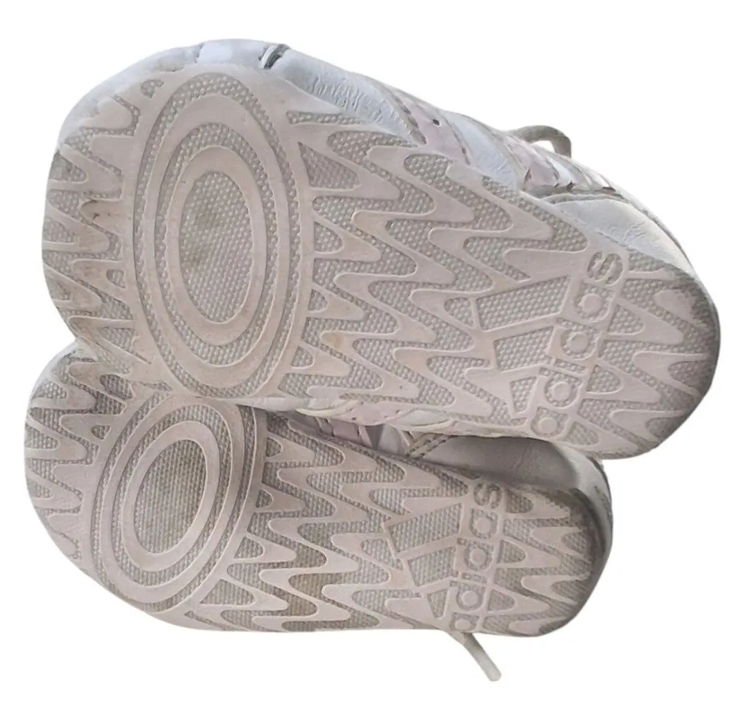 Adidas små hvide bløde sko str. 18 med lyserøde detaljer, blød bund og med hvide snørebånd.