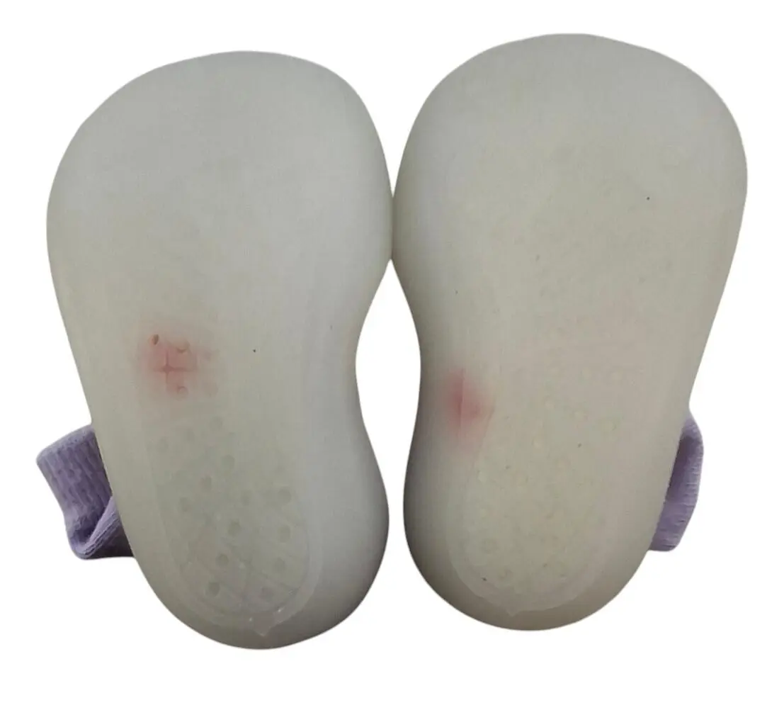 Små hvide og lilla skridsikre sko str. 19-20 (11.5 cm) med en elastisk strømpe med et fint ræve ansigt. Ukendt mærke.