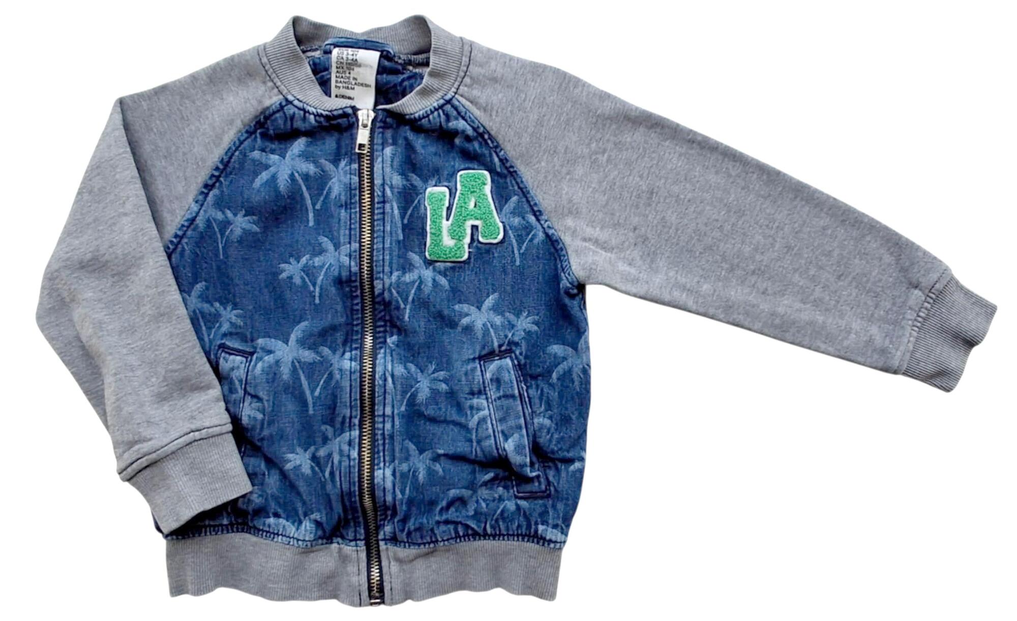 H&M blå denim og lysegrå cardigan str. 104 med lysegrå rib kante, en grøn applikation på forsiden og med en lynlås ned foran.