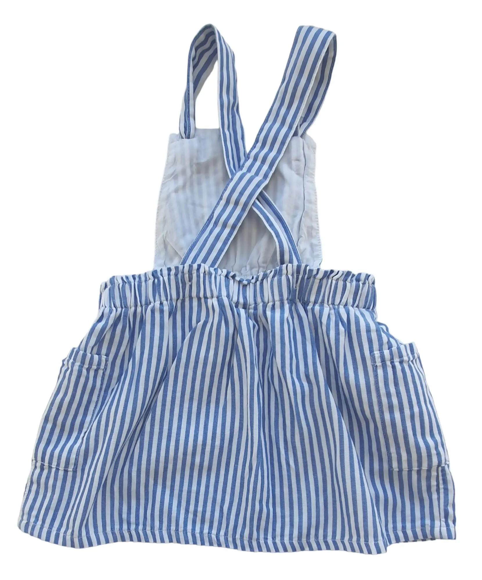 H&M blå og hvidstribet kjole str. 80 med elastik i taljen, lommer på siden, smæj og seler med knuder på forsiden.