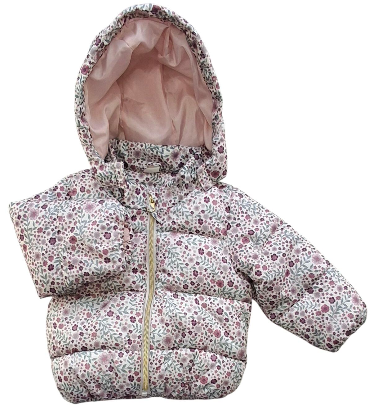 H&M råhvid småblomstret vinterjakke str. 74 med hætte, elastik nederst på jakken og i ærmerne, og med en guldfarvet lynlås ned foran.