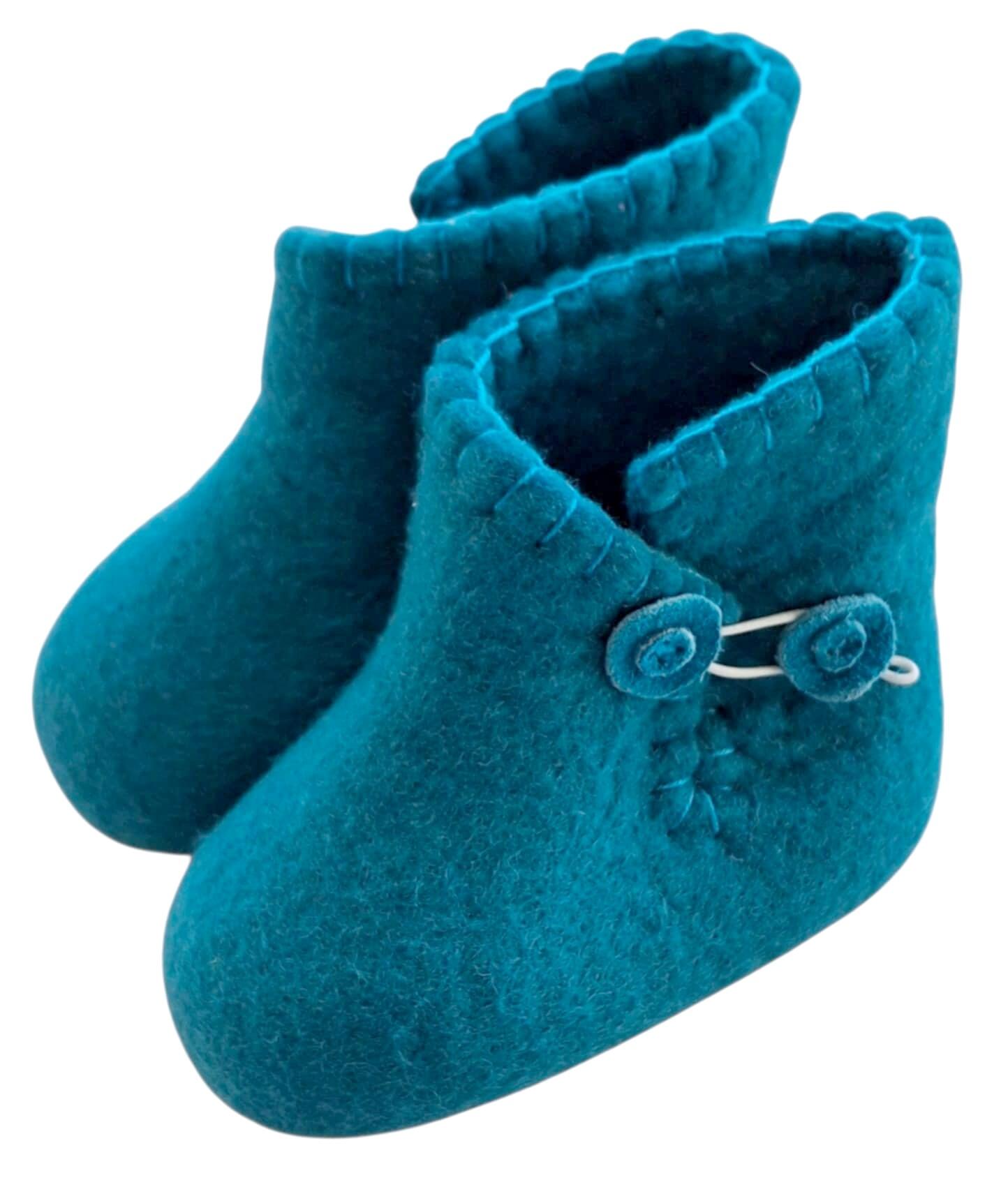 Hjemmefiltede turkisblå uld futter str. 18-19 (68-74) med fine syede kanter og med elastik på siden af skoene.