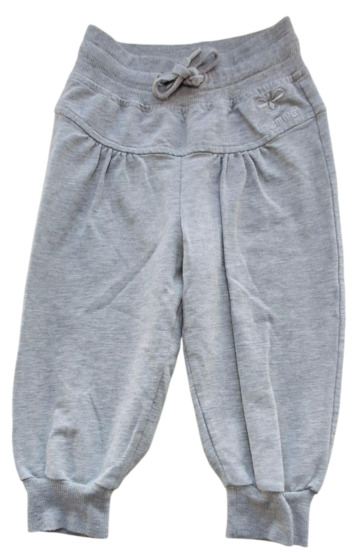 Hummel lysegrå lang bukser str. 92 i en baggy model med rib i benene og med bred rib i taljen. 97% bomuld, 3% elastane.