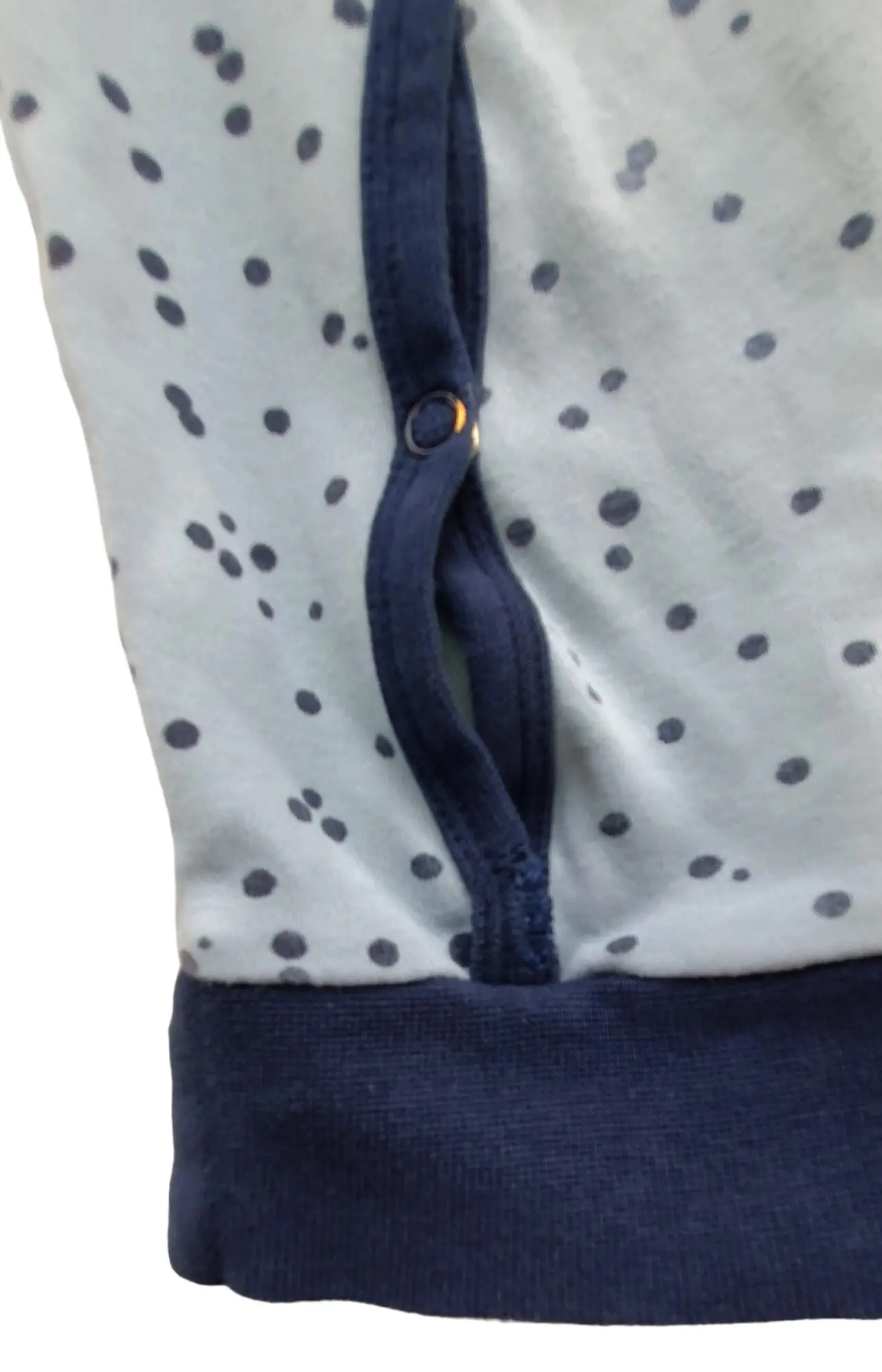 Me too lyseblå prikket heldragt str. 74 med mørkeblå kanter og trykknapper fra hals til fod. Obs der er en reparation nederst på det ene bukseben, se billede.