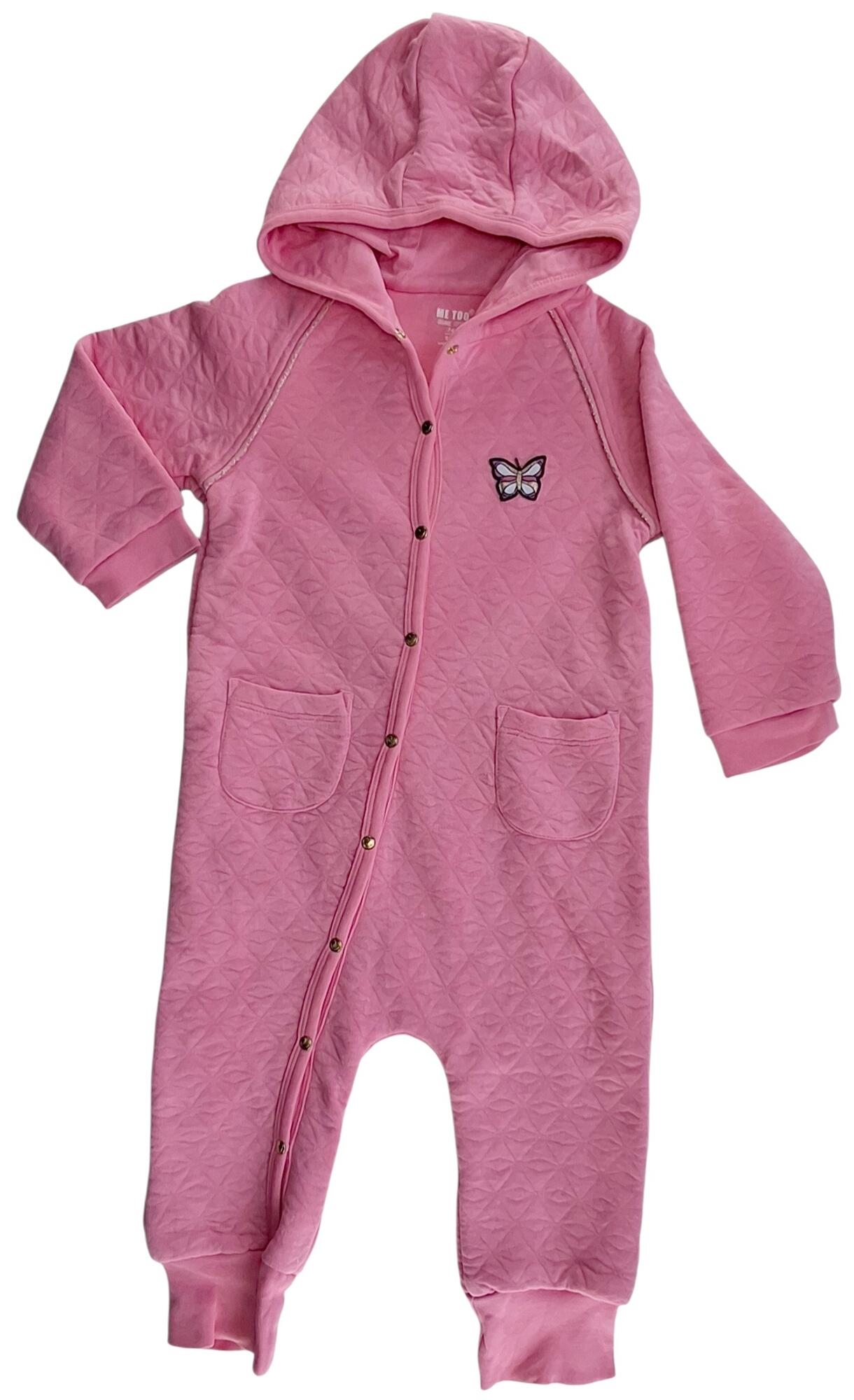 Me Too pink vatteret heldragt str. 74 med hætte, to lommer, lille sommerfugl applikation og med trykknapper fra hals til fod.