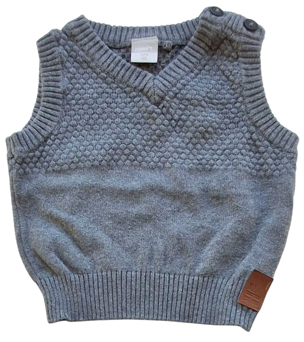 Name it grå finstrikket vest str. 56 med et perlestrikket mønster på den øverste del og med to knapper på skulderen. 100% bomuld.