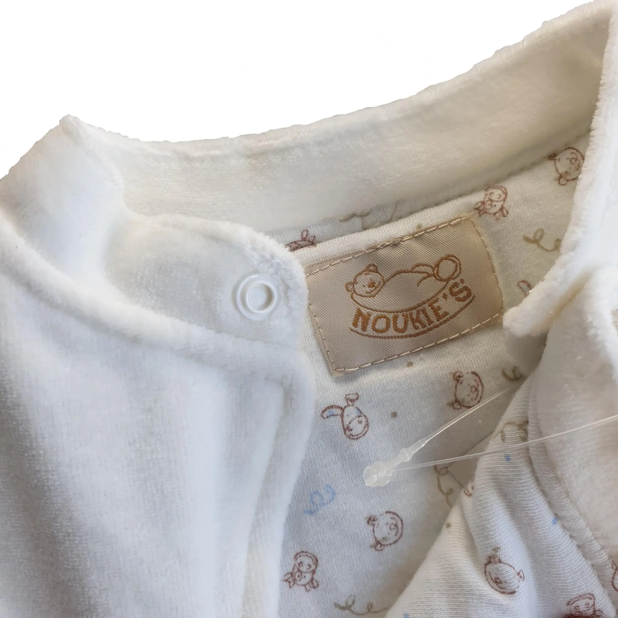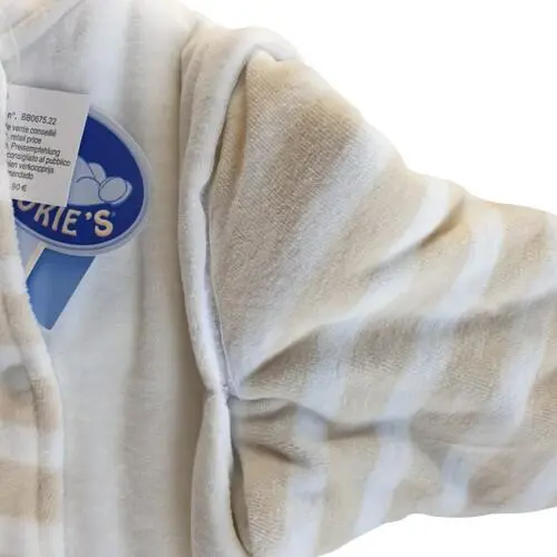 Ny Noukie's råhvid/beige blød velour sovepose med ærmer der kan tages af og på med velkro, dobbelt række knapper for let adgang, bomulds for på indersiden og huller så der kan bruges barnevogns sele/autostol