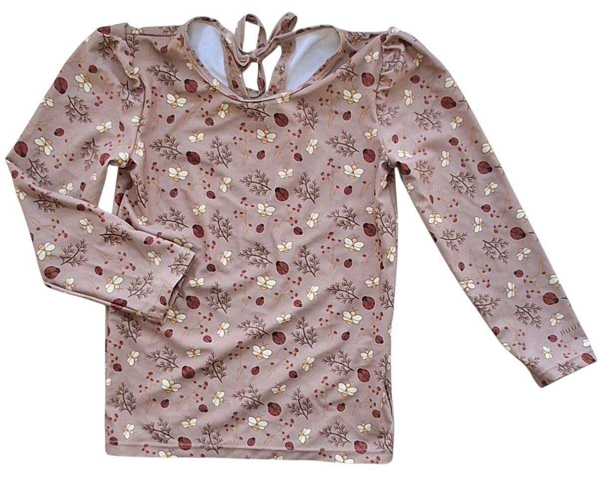 Ny Nuuroo rosa langærmet UV badebluse str. 110-116 med søde læg på skuldrene ved ærmerne og med et bindebånd i nakken.