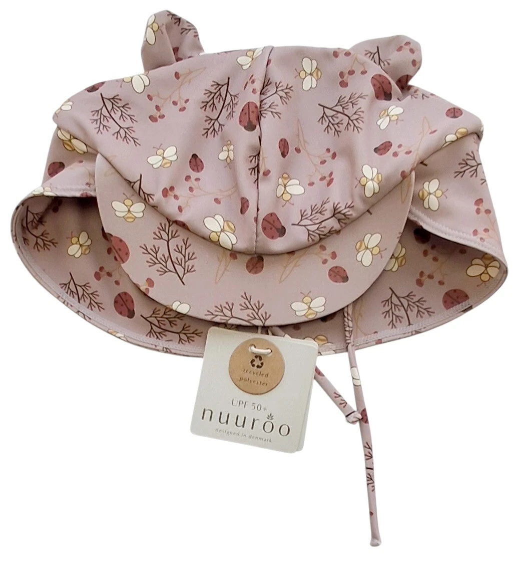 Ny Nuuroo rosa UV solhat med skygge og med et sødt tryk med mariehøns og bier, hatten har små ører, nakkebeskyttelse og bindebånd under hagen.