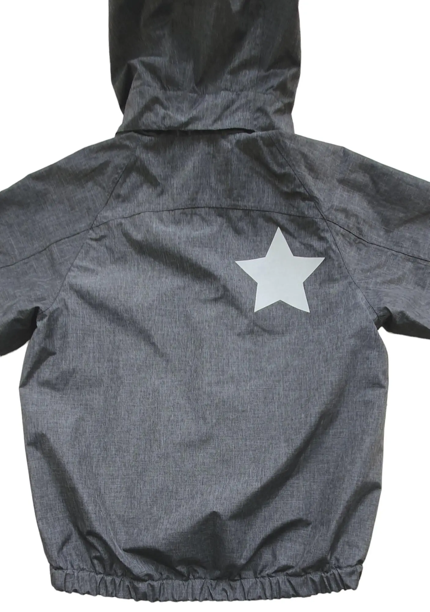 Molo grå langærmet vindjakke str. 110-116 med en hætte, elastik i ærmer og nederst på jakken, to lommer, og med lynlås og velcrolukning ned foran.
