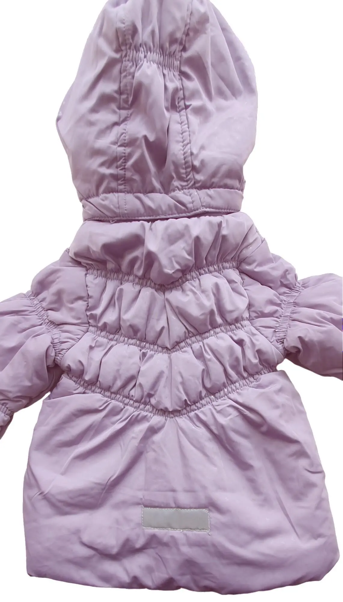 Name it lyselilla vinterjakke str. 80 med en hætte, rib i ærmerne, to lynlåslommer og en lynlås lukning ned foran.