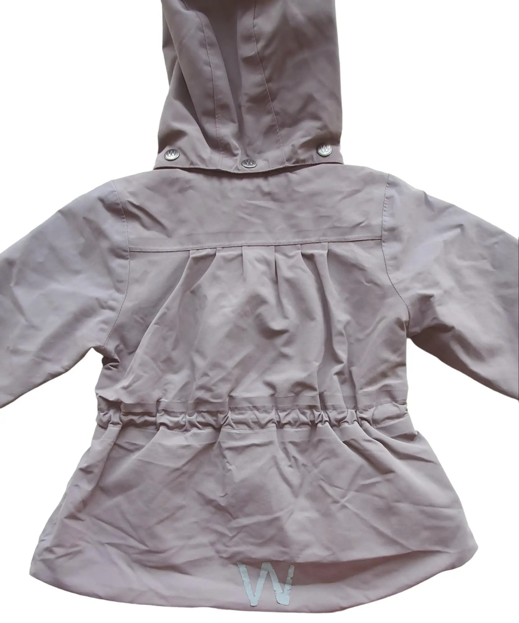 Wheat lilla overgangsjakke str. 86 med aftagelig hætte, elastik i taljen, to lommer foran, elastik i ærmerne, og lynlås og trykknap lukning foran.