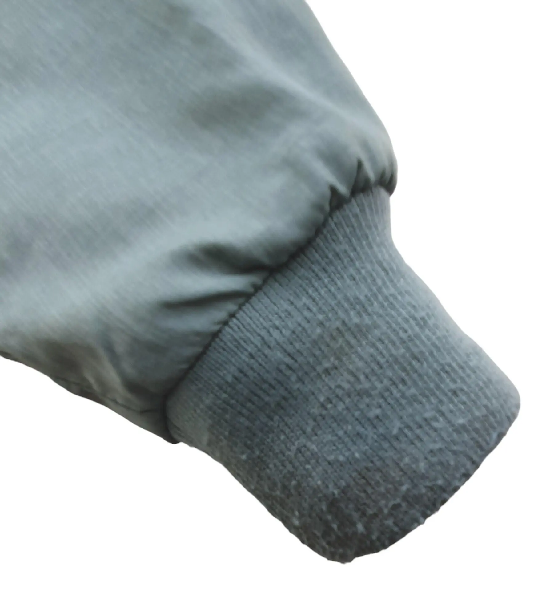 Minymo lys grågrøn tynd jake str. 80-86 med en hætte, ribelastik i ærmer og nederst på jakken, to lommer og en hvid lynlås ned foran. Obs ribkanterne har lidt fnuller.