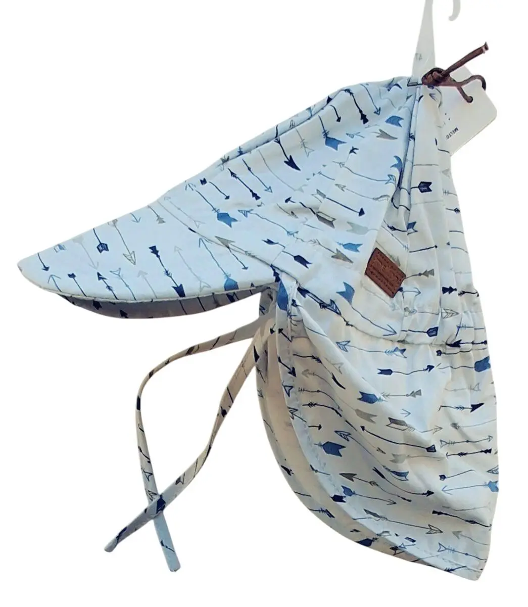 Ny Melton outwear lys gråblå solhat str. 47 cm (12-18 M) med tryk af pile i forskellige farver og med skygge, nakkebeskyttelse og bindebånd under hagen.