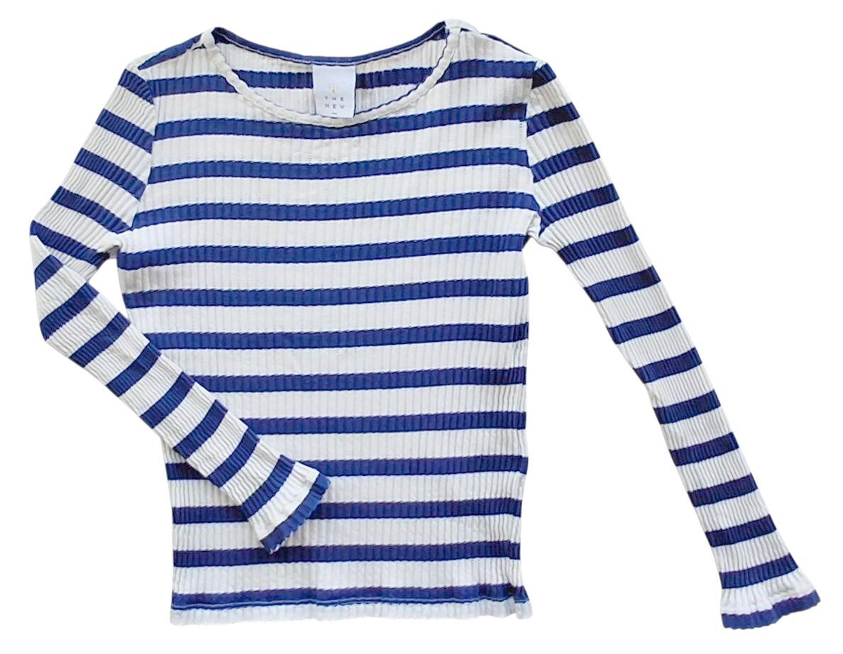 The New råhvid og blåstribet bluse str. 9-10 med et fint lille hul mønster og en rund halsudskæring. 100% bomuld.