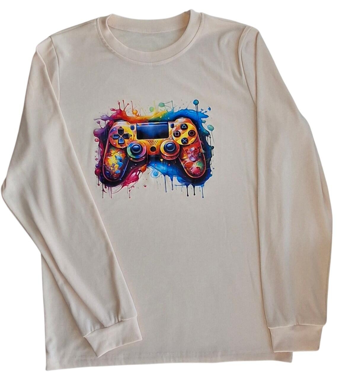 Ny lys ferskenfarvet langærmet bluse str. 170 med rib kanter og med et flot tryk på forsiden. Ukendt mærke. 95% polyester, 5% elastane. Ny uden prismærke.