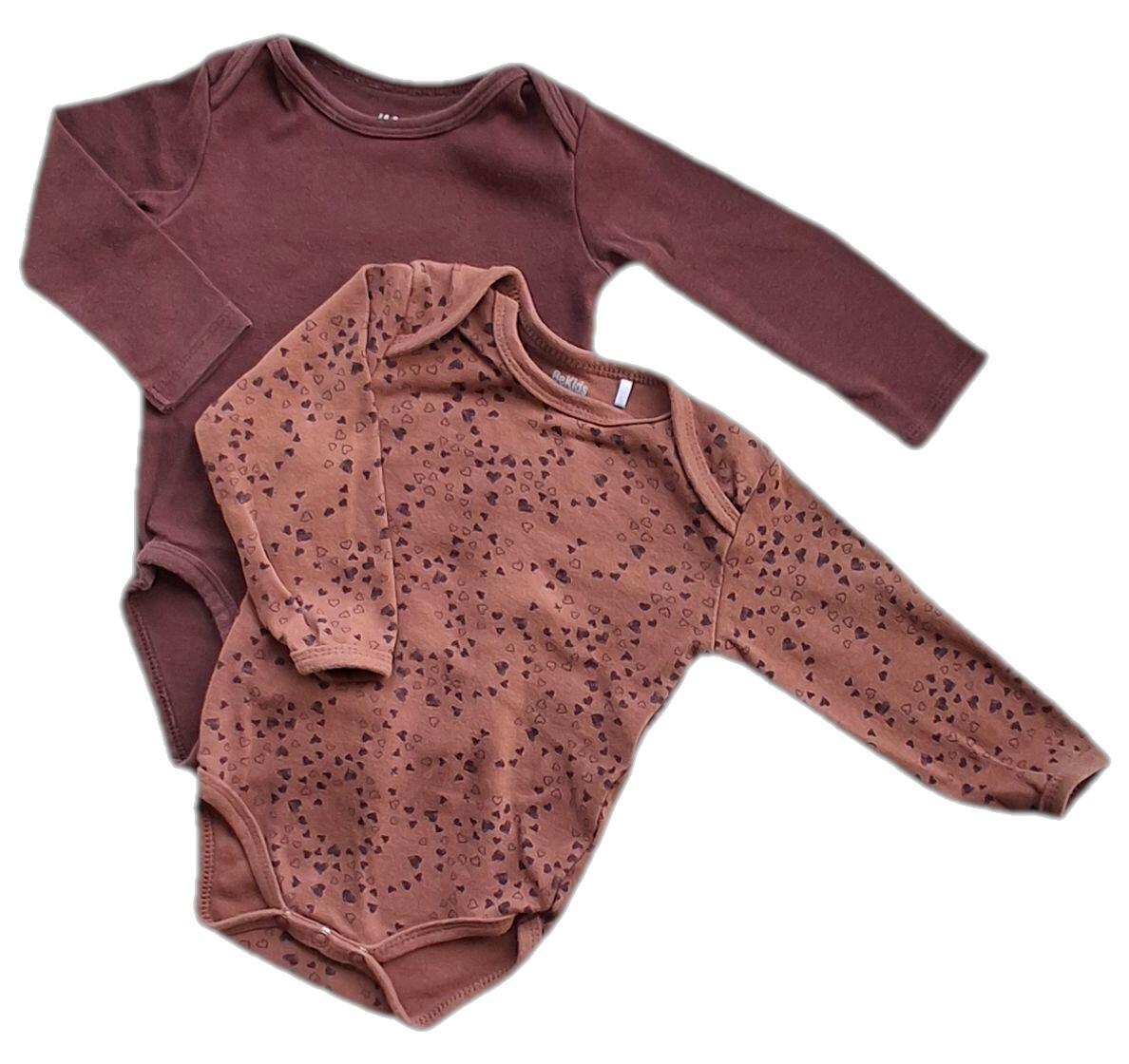 Bekids langærmet rødbrun body og en H&M body str. 74. Be kids bodyen har et sødt hjerte tryk over det hele, den anden er ensfarvet og begge har amerikansk halsudskæring. 100% bomuld.