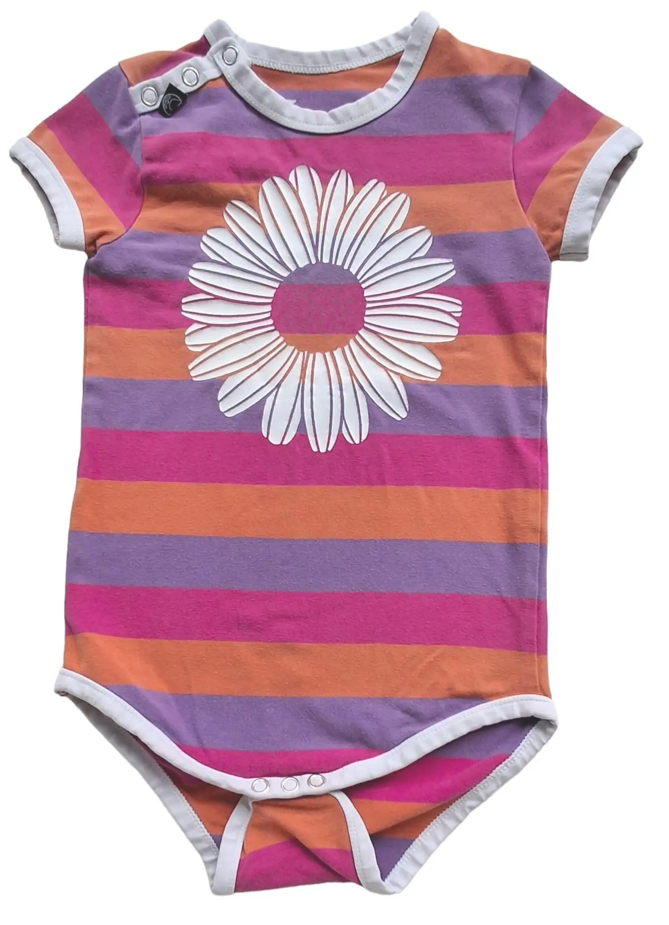 Danefæ kortærmet stribet body str. 1,5 år, hvide kanter, flot hvidt blomster motiv på forsiden og med tre trykknapper på den en skulder.