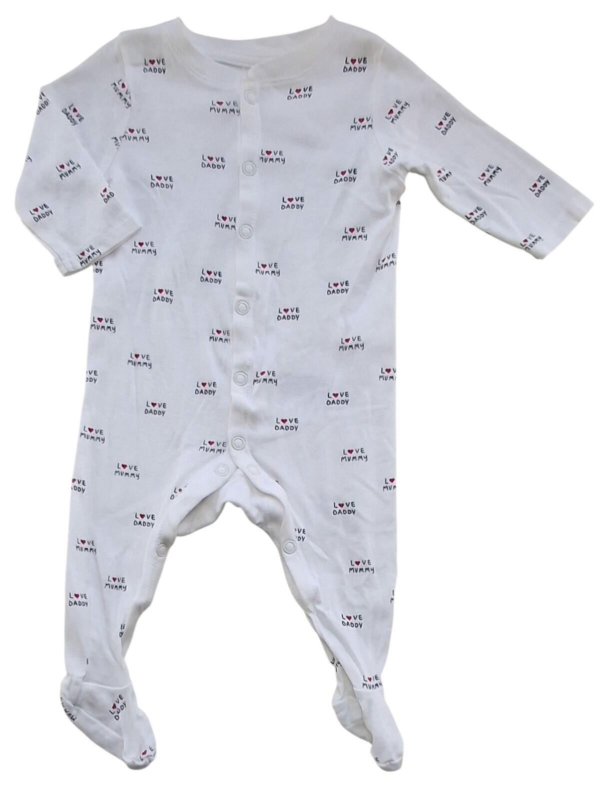 H&M langærmet hvid natdragt str. 56 med tryk af "I love daddy" og "I love mummy" med fødder og trykknapper fra hals til fødder.