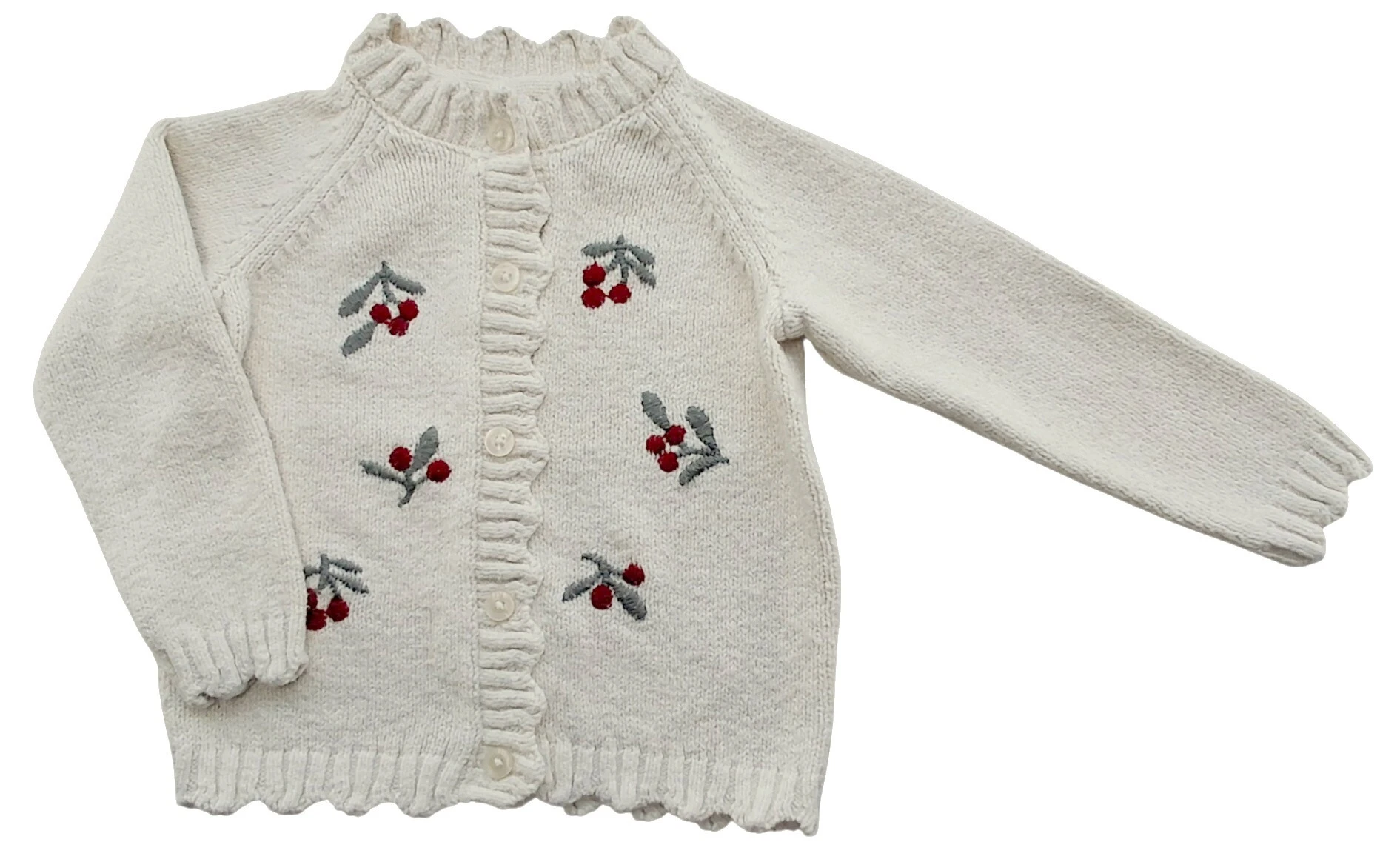 H&M råhvid langærmet striktrøje str. 104 med søde kirsebær broderier på forsiden og med knapper ned foran.
