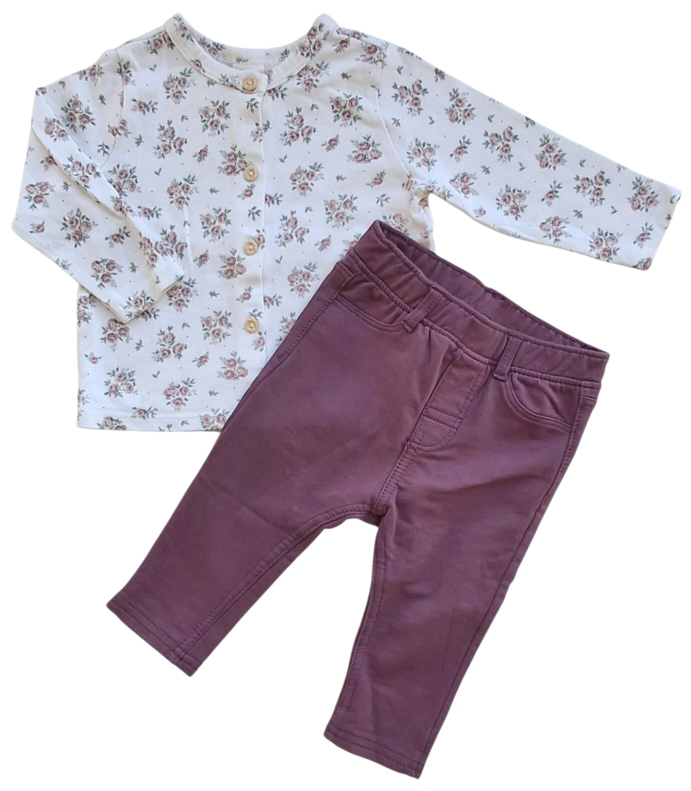 H&M rødlilla bukser og blomstret sweat bluse str. 68 . Bukserne har to baglommer og elastik i taljen. Blusen er hvid, har lange ærmer og knapper ned foran.
