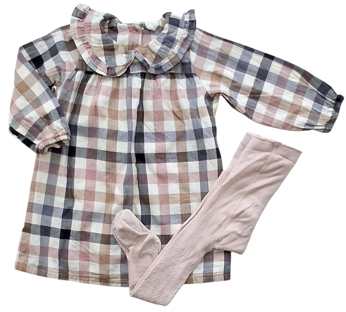 H&M rosa ternet langærmet kjole str. 80 og rosa strømpebukser fra Name it. Kjolen har en fin krave, elastik i ærmerne og to knapper i nakken.