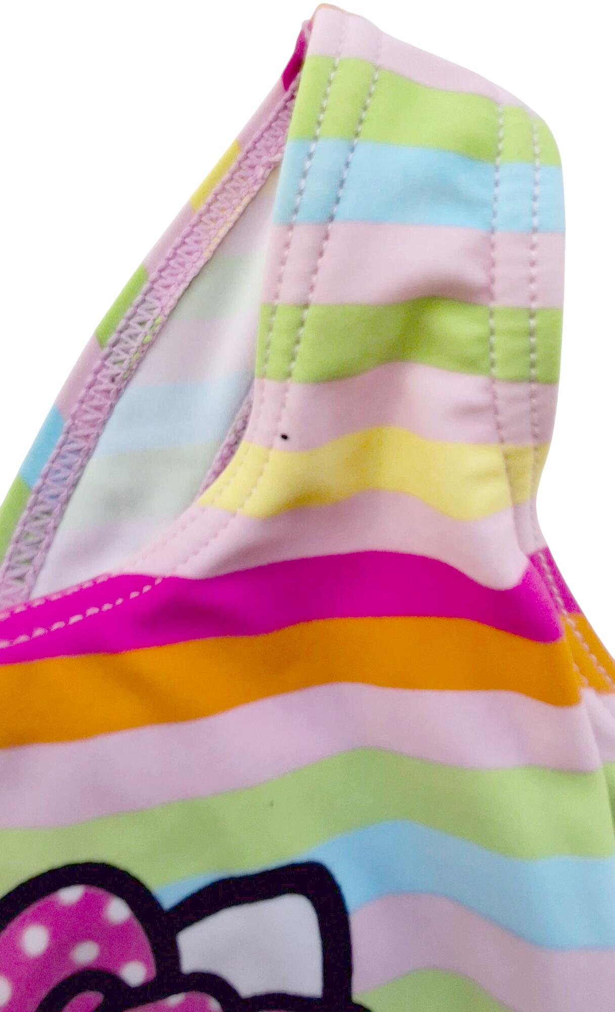 Hallo Kitty farverig stribet badedragt str. 80 med et stort Hallo Kitty tryk på forsiden og en lille pink flæsekant ved ben udskæringen. Obs en lille sort prik, se billede.