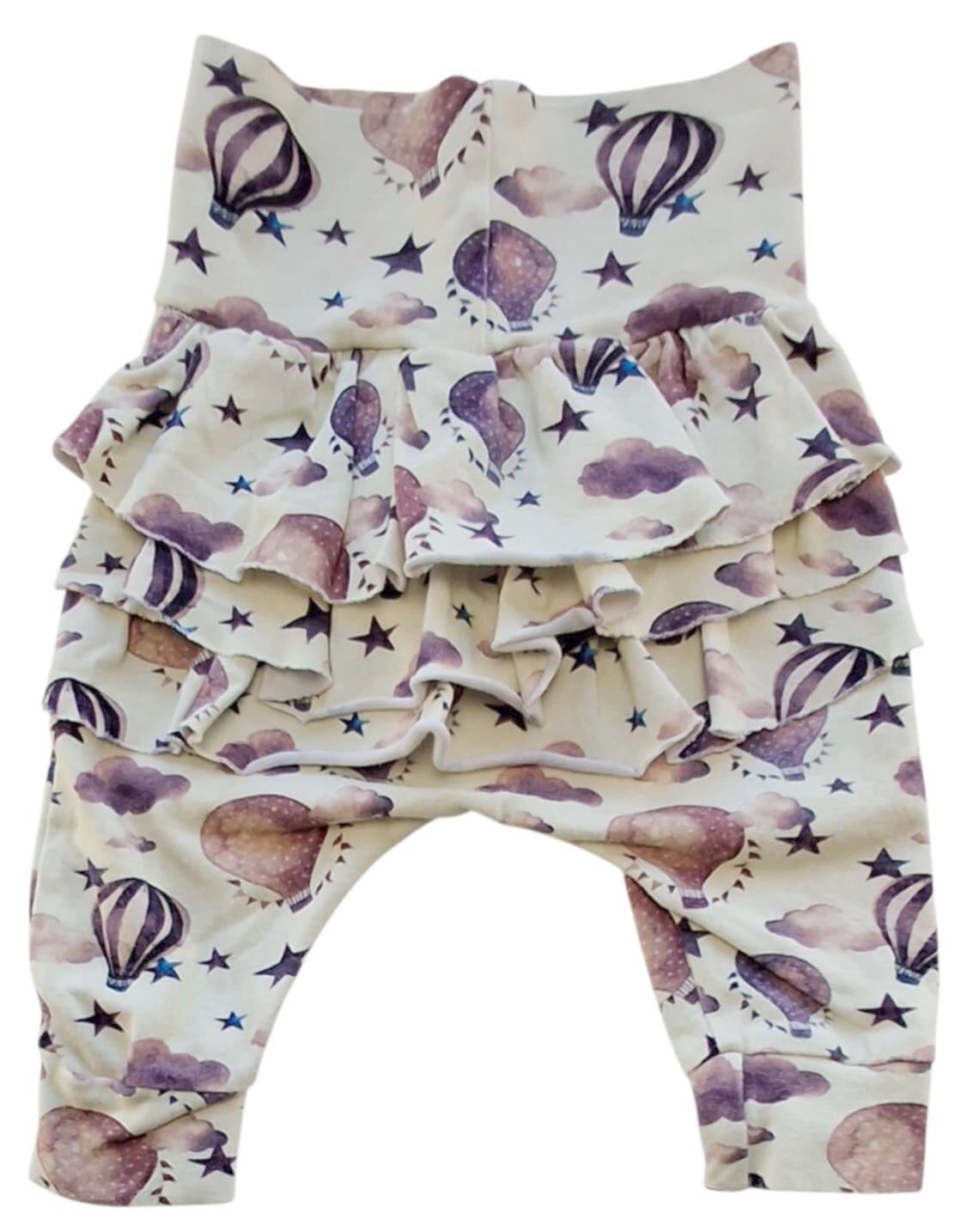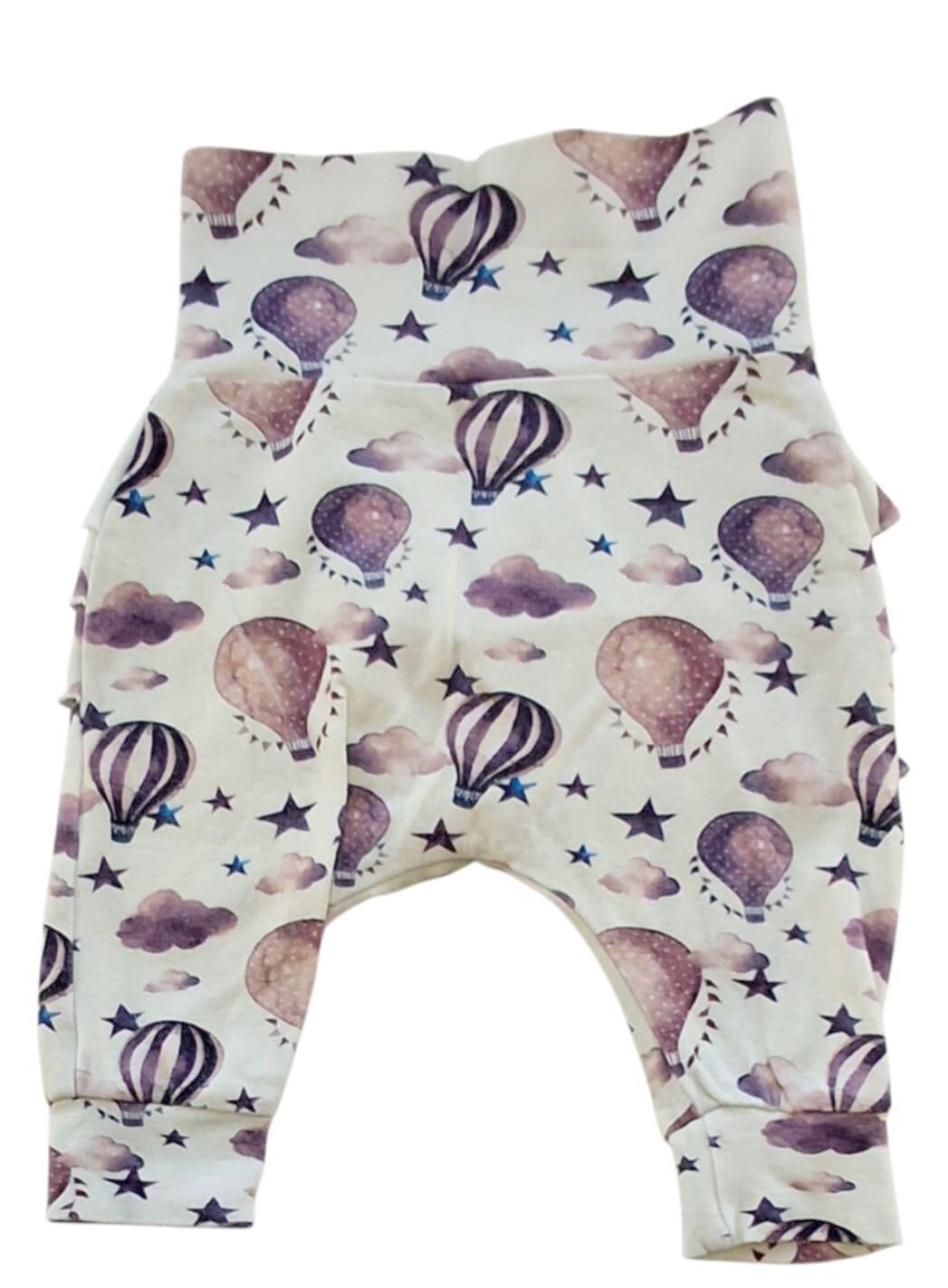 Hjemmesyede beige babybukser str. 56 i en kraftig kvalitet med tryk af luftballoner, og med flæser på bagsiden.