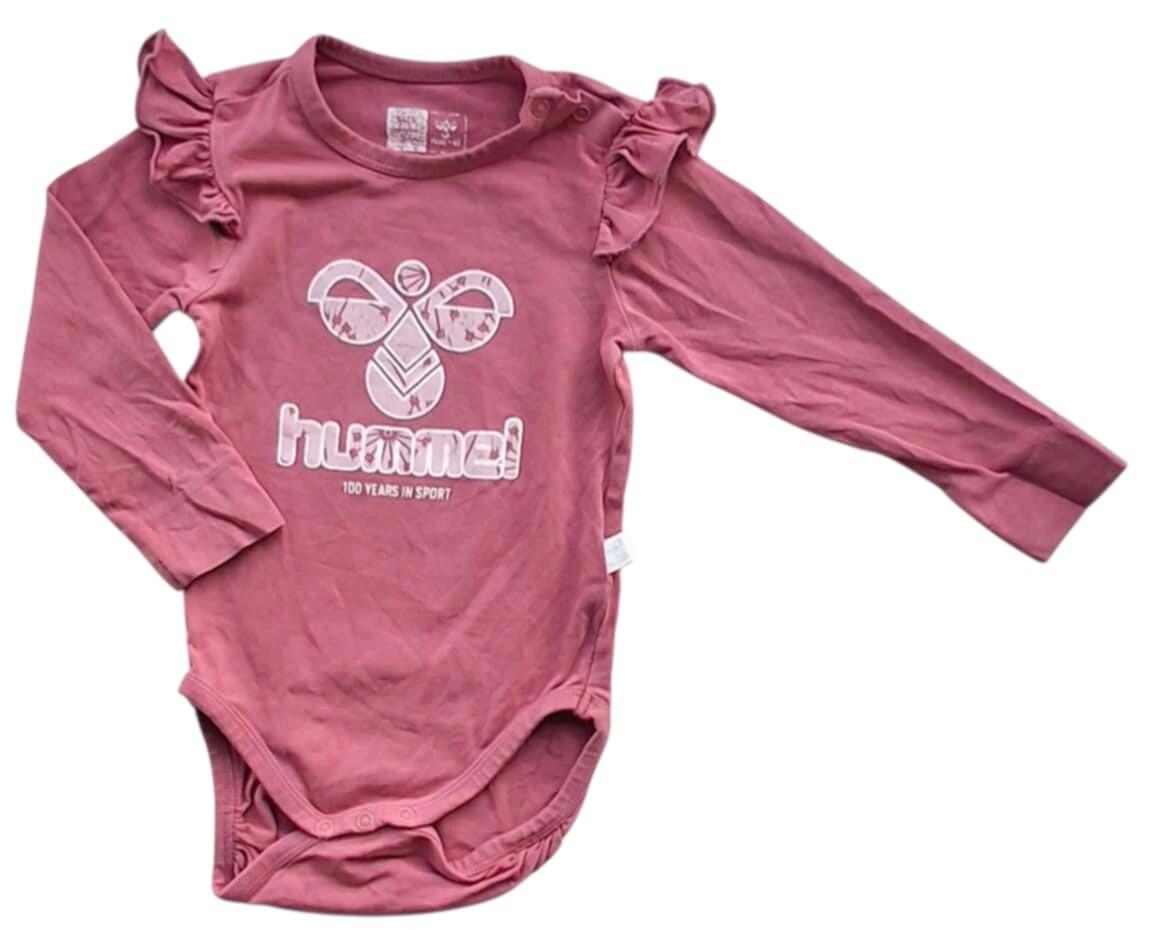 Hummel mørke rosa langærmet body str. 74 med flæser over skuldrene og et fint tryk på forsiden. 95% bomuld, 5% elastane.