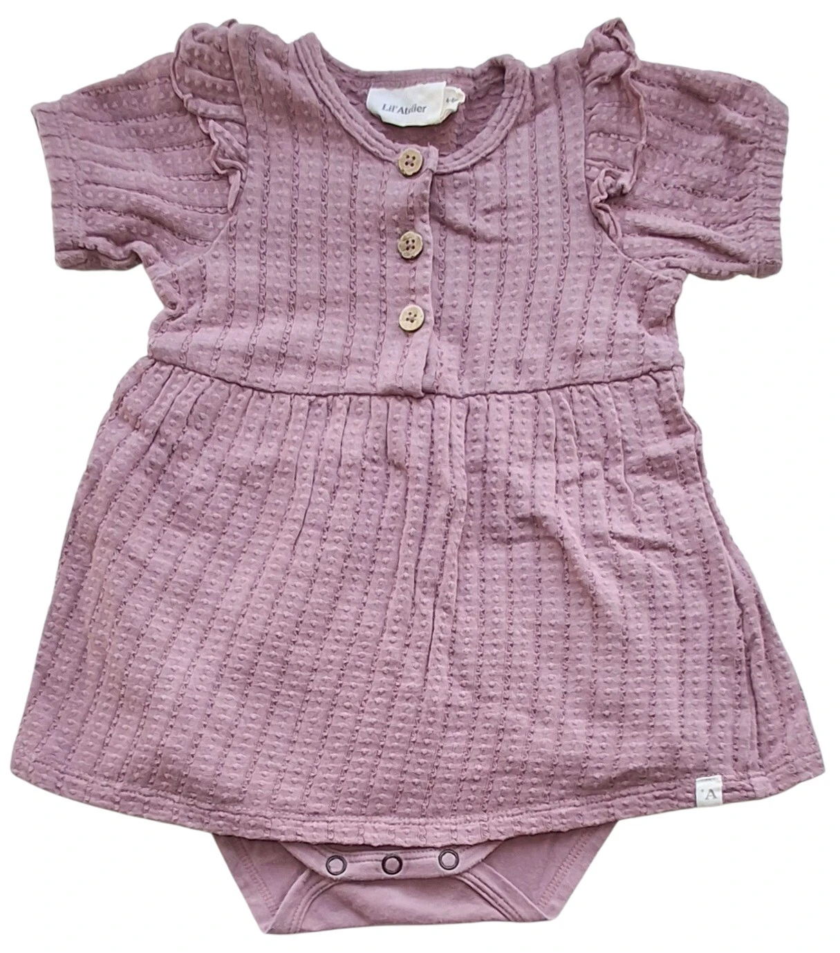 Lil'Atelier mørk rosa kortærmet bodykjole str. 68 i et "vaflet" stof med lodret hulmønster, flæser over skuldrene og med tre knapper i stolpelukning.