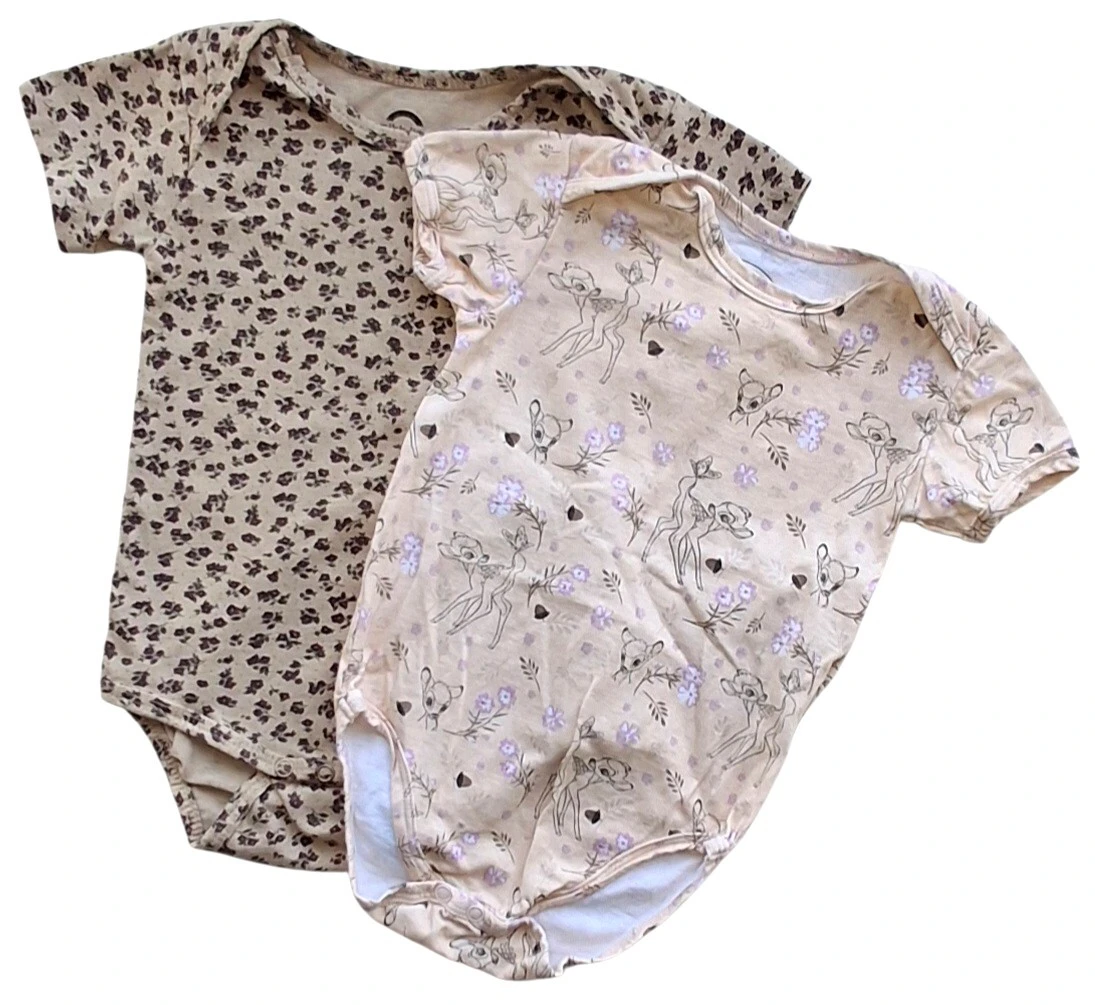 Mikk-Line og Disney kortærmede bodys str. 86. Mikk-line bodyen er blomstret og i str. 86. Disney bodyen er med blomster og Bambier og i str. 86-92.