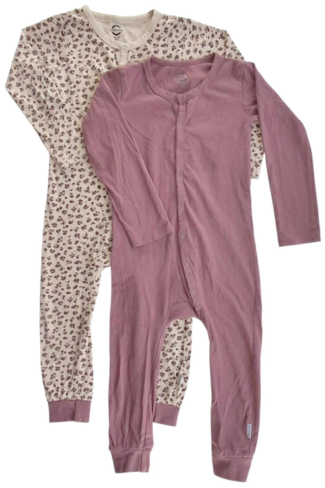 Mikk-line to flotte natdragter str. 98 med trykknapper fra hals til fod. Den lysebrune er småblomstret og den anden er ensfarvet. 100% bomuld.