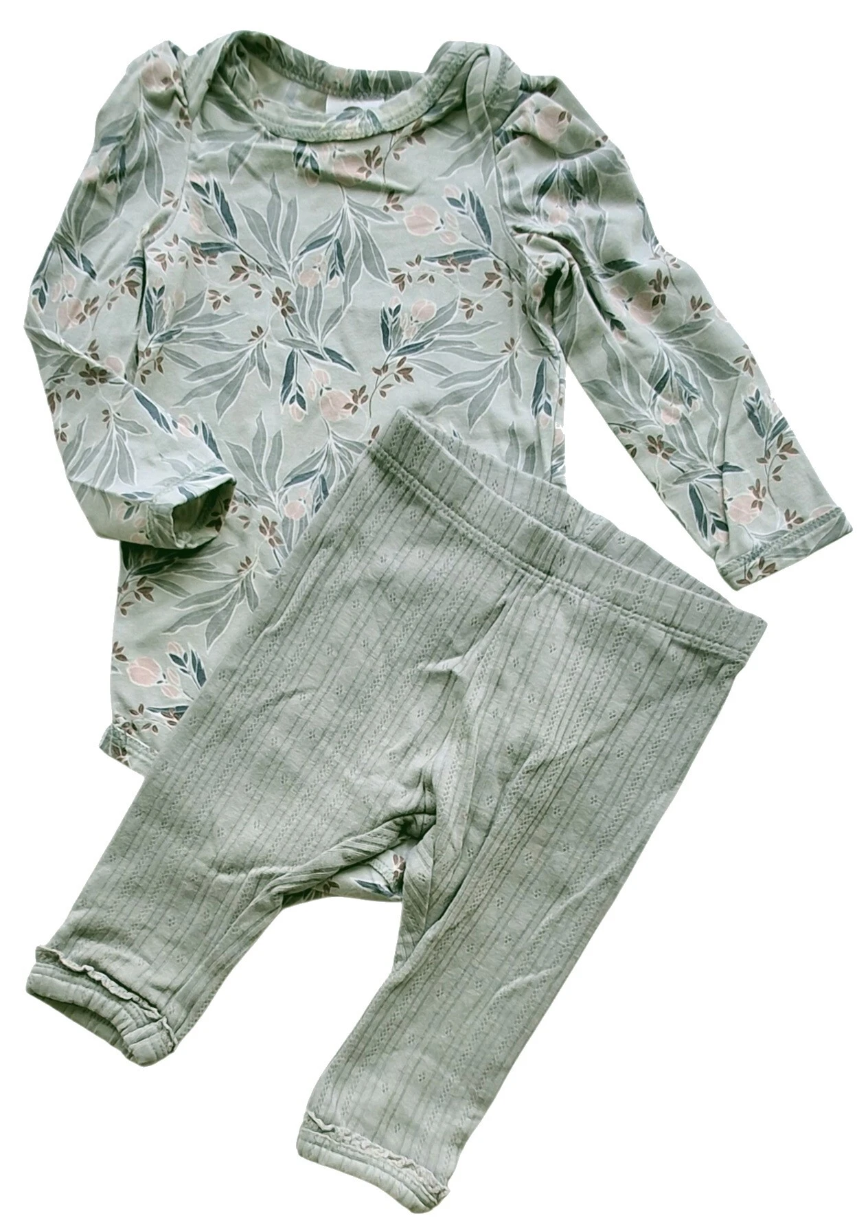 Müsli grågrøn body og Name it leggings str. 62. Bodyen er langærmet og med tryk af blade og blomster. Bukserne er grågrønne og med et fint lodret hulmønster og med elastik i taljen.